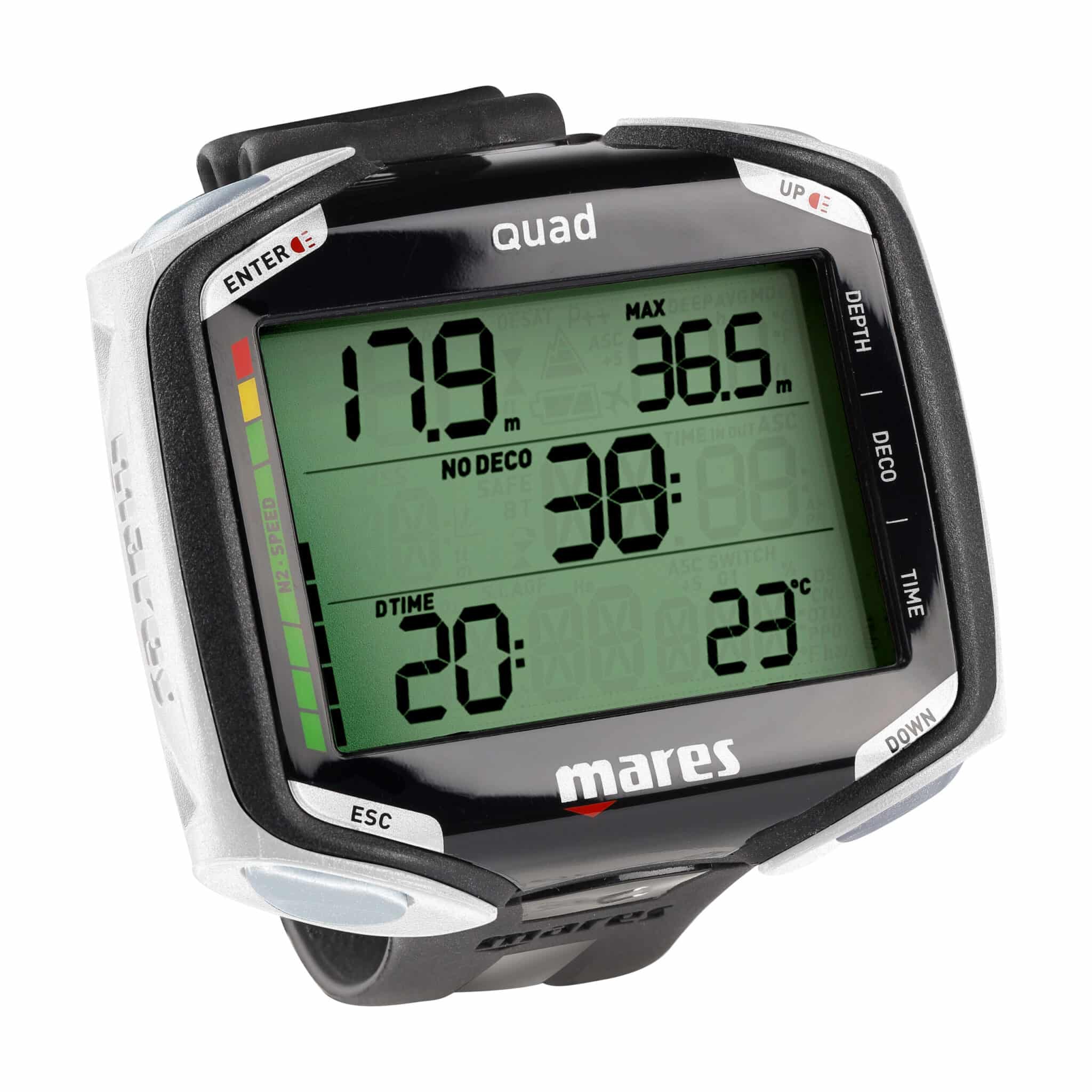 Der Quad-Tauchcomputer verfügt über einen besser sichtbaren Bildschirm, dank seiner Größe und 3 Zeilen mit Informationen im „Jumbo-Format“.